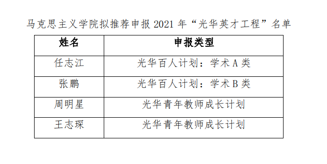 根据学校《关于开展2021年“光华英才工程”申报工作的通知》的要求,太阳集团tcy8722网站严格遵照申报标准及程序,在老师个人申报基础上,经学校相关部门认定成果、学院党总支委员会政治把关、学院教授委员会、党政联席会研究决定,拟推荐任志江等4位老师参加学校“光华英才工程”项目评选。